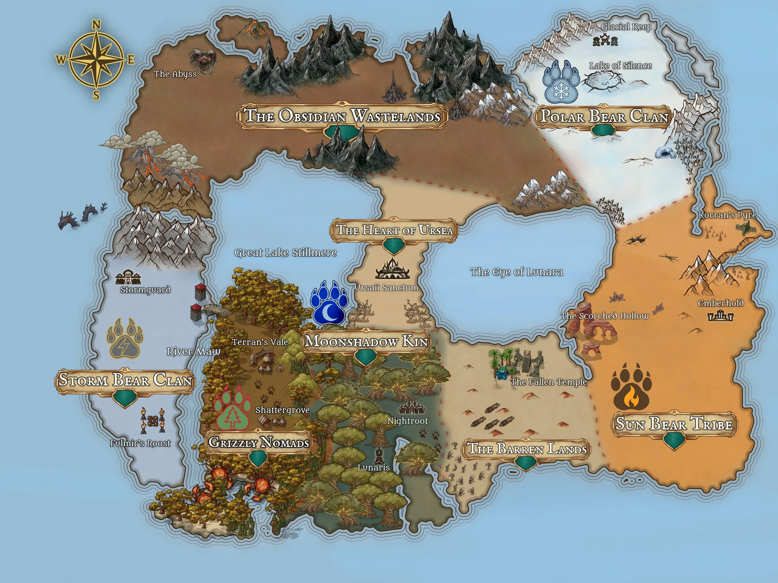 Explore this to uncover sacred landmarks, legendary battlefields, and elemental territories belonging to the Grizzly Nomads, Storm Bear Clan, Moonshadow Kin, Polar Bear Clan, and Sun Bear Tribe.